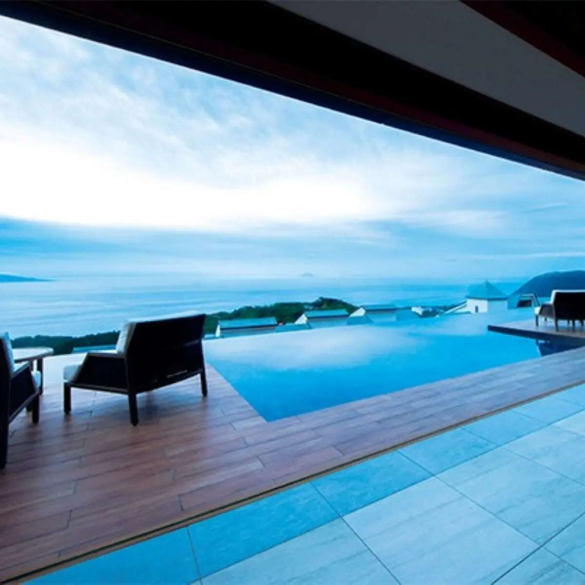 インフィニティ風呂つきスタンダードスイートの客室。スタンダードスイートには、青森ヒバ、御影石など素材が異なる内風呂が備わる。露天風呂つきや庭がある客室、ペット可の離れなど客室の種類は多様