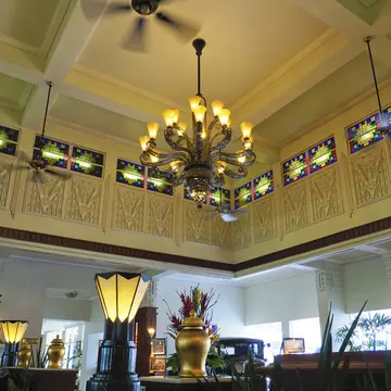 ロビーラウンジの一角。アーチ型の窓とステンドグラスは創業当時のまま保存されている。