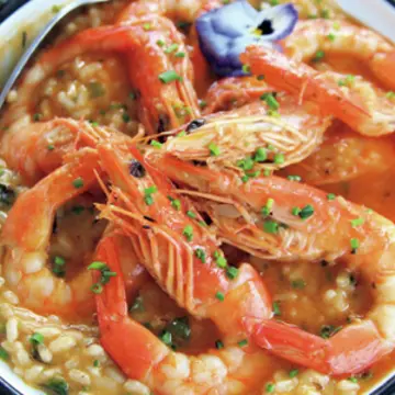 ❶エビがたっぷり入った、魚介の雑炊風。コリアンダーがアクセント
