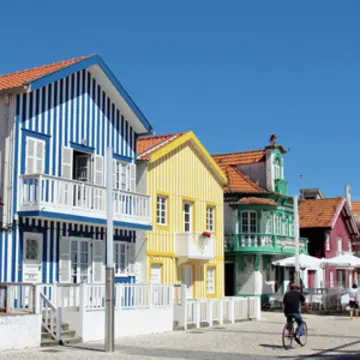 アヴェイロからバスで約35分の、ストライプのカラフルな家々で有名な町。もとは、漁から戻る漁師たちが、自分の家を遠くから見つけやすくするために始めた工夫だった。現在でも住人は多いが、夏はビーチ目当ての観光客が増えてさらににぎやかになる。市場近くにはシーフードレストランも多く、魚介やエビ、カニなどをゆでたりグリルでシンプルに食べる海辺ならではのメニューや、海鮮鍋、米と煮る雑炊風なども人気。