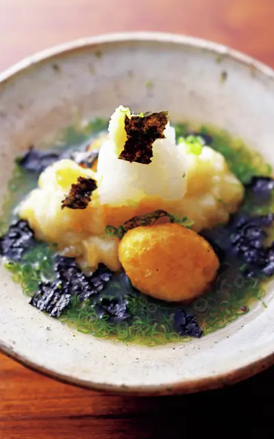 「夜遅くに京都入りしたときや、東京に戻る前に立ち寄るお店です。一品で、しかも量を調整してくれるのでひとりごはんに最適」(副編M山) 店主の田中義人さんは、年は若いが、『京都和久傳』で5年修業を積み、ニューヨークの精進料理店『Kajitsu』の立ち上げに副料理長としてかかわったキャリアの持ち主。メニューにもその経験から得た技や発想が生かされ、定番の料理にもひと工夫が光る。