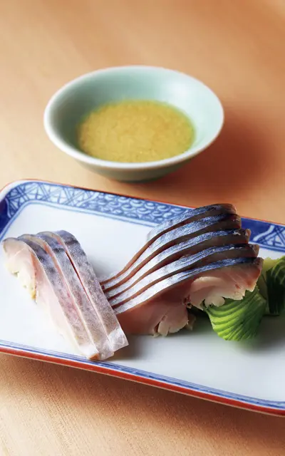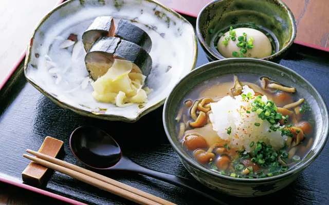 京都の鯖寿司は店や家ごとの味があるが、こちらのは身厚の鯖と醤油風味の寿司めしののり巻き風。ランチでは、にゅうめんと煮卵がつく定食にして供される。にゅうめんは月や季節で内容を替え、残暑が厳しい9月は冷たいおろしそうめんに。