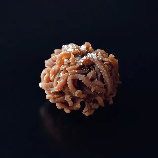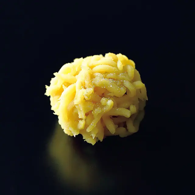 塩芳軒では二十四節気に合わせてほぼ半月ごとに菓子を替え、9月後半ごろからショーケースの中は秋めいてくる。一年の中でも題材が豊富なときで、先駆けは重陽や秋草、名月。やがて菊や紅葉となり、菊は重陽の菊を表す「菊の香」から「菊日和」「まさり草」「光琳菊」を経て、1月下旬の「寒菊」まで長く続く。紅葉の菓子は変化の妙があり、「山路」「照葉」「初霜」「並木道」「錦秋」「山もみじ」などが順に登場し、葉先の色づきに始まり、紅に染まり、霜に震え、最後は朽ち葉へと移り変わる。素材も秋になると新物の栗やさつまいも、山いもやあずきが出まわり、白あんに小麦粉を混ぜて蒸してよく練ったこなしという生地や羽二重餅がよく使われ、味わいも増す。「わずかな違いで表現しているので、想像力をもって味わっていただくといろいろな秋を感じてもらえます」。小さな秋ながら、奥深く、楽しみはつきない。