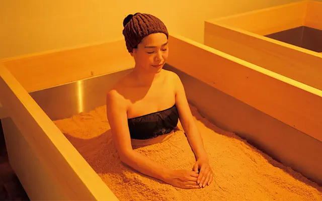 『酵素浴えんHANARE 京都店』の酵素浴では、吉野ヒノキのパウダーに、野菜、野草、果物から抽出したエキスを合わせて、自然発酵による発熱でじっくりと体を温める。15分で¥9,763(税・サ込)