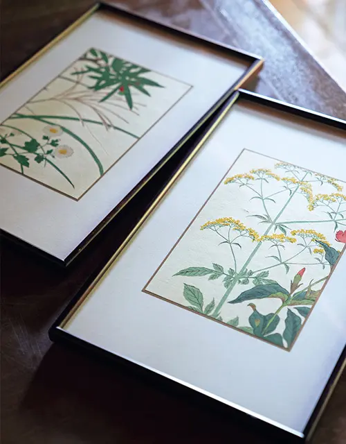 なかでも植物画は日本のボタニカルアートのよう。こまやかな筆の運びや斬新な構図で、酒井抱一(ほういつ)や鈴木其一(きいつ)といったおなじみの琳派作家の作品も。版画であれば1万円までで手に入り、作品がピタリと収まるオリジナルの額がそろうのもうれしい。
