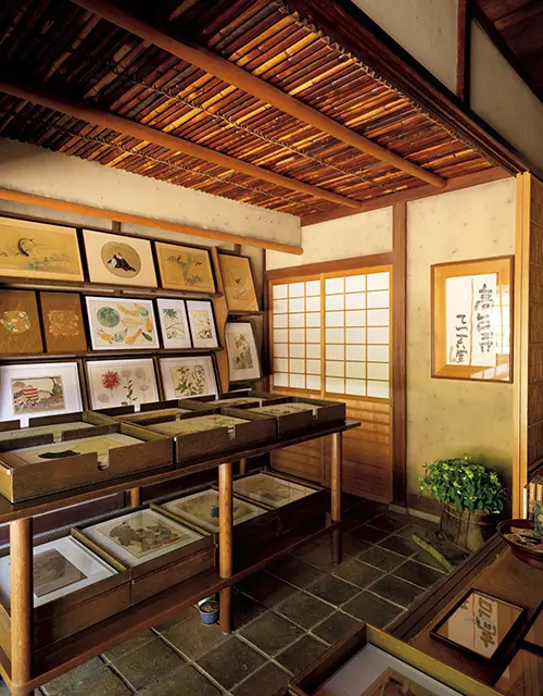 骨董や伊万里の器好きなら誰もが知る『てっさい堂』の高台寺店。古い屏風や画集の作品からとった肉筆画や版画を多数扱い、一点ものの絵にして販売している。100年以上前のものだが古びず、今の暮らしになじむものばかりだ。
