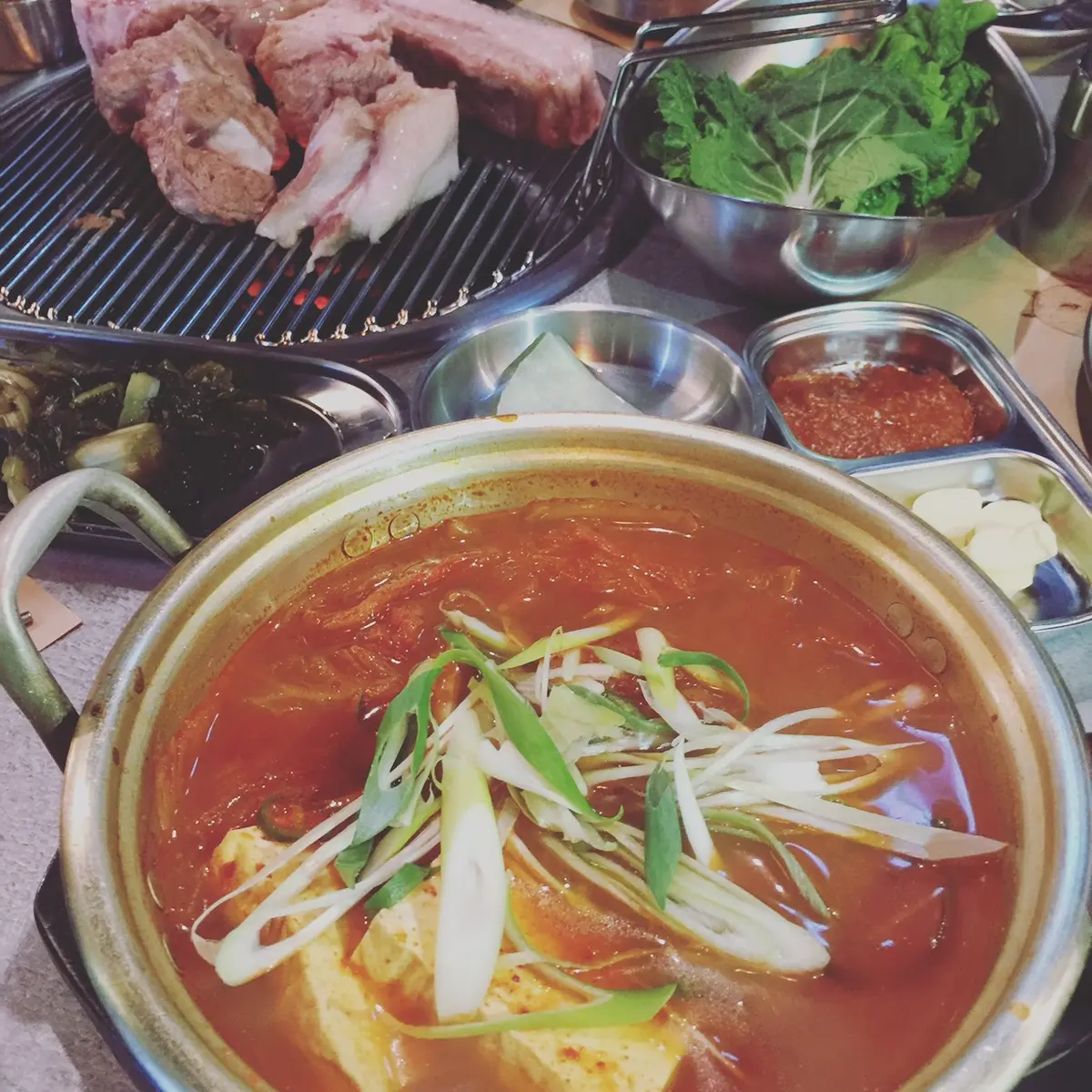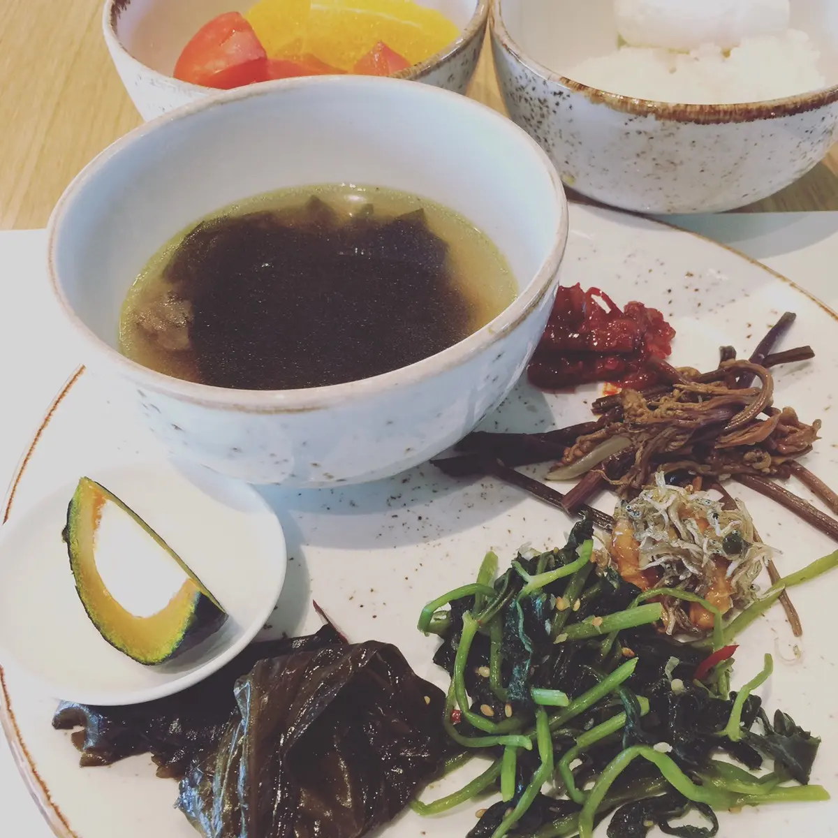 リゾート内の韓国料理、済州膳(チェジュソン)でジャガイモのビビンバとウニ入りワカメスープ。見目麗しく美味!