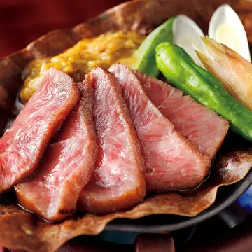 店主の今井さんは、高山の中心街にあった店を、少し離れた見晴らしのいい場所へと5年前に移した。豊かな自然を生かして何ができるか……毎朝山へと出向き、春は山菜、夏は川魚、秋はきのこ、季節折々の食材を調達し腕をふるう。全国に常連をもつお店だ。A-5等級のみを使う飛騨牛の石焼きは、「お肉はタイミングがなによりも大事」と、スタッフがつきっきりでサービス。「松阪牛や神戸牛に比べ、飛騨牛の脂はすっきりしているので、かなりサシの入ったお肉でも、2枚、3枚……とお箸がのびます。シンプルに塩で味わうなら、タンニンがじゃまをする赤ワインより、キレとうま味のある大吟醸」。肉=赤ワインの固定観念が吹き飛ぶ、いつまでも余韻を噛み締めたいマリアージュ!