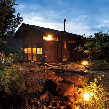 店主自ら手がけた石の中庭から望む、古民家風の離れ。ほかにモダンなカ1 ウンター席、掘りごたつ席もある
