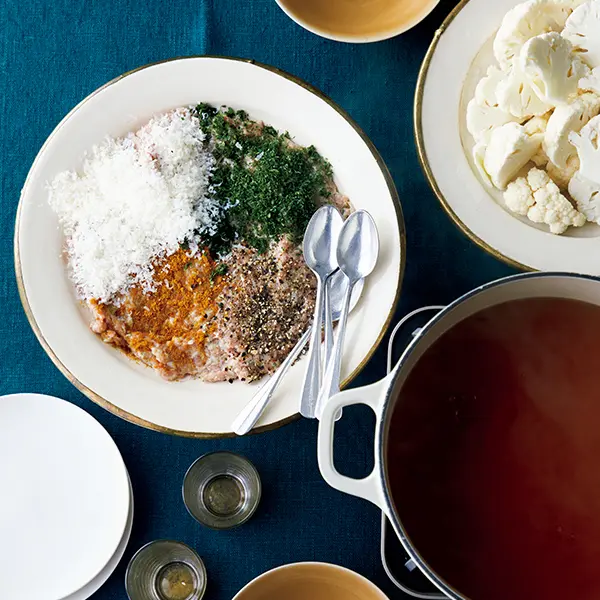 3.鍋にC を煮立て、各自が2 の好みの味のつくねをスプーンですくって入れる。3分ほど中火で煮込み、カリフラワーも加えてさっと煮て一緒にいただく。