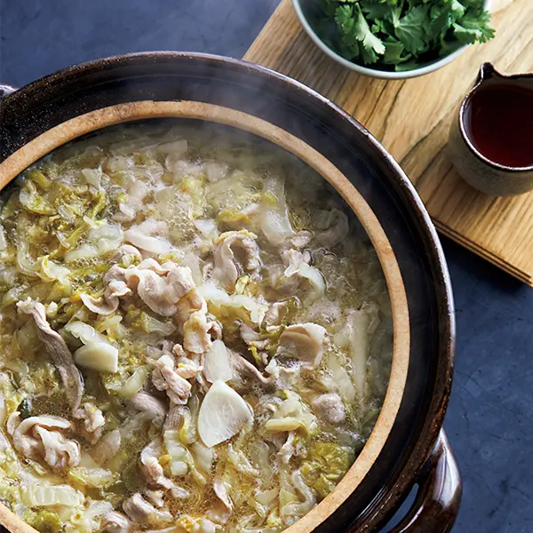 台湾で大人気の酸菜白肉鍋をアレンジ。くたっと煮えた白菜と豚肉のうま味に、香菜の香りと黒酢の酸味がぴったり!