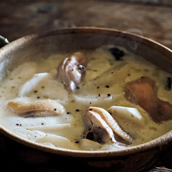 骨つきの鶏肉から出たうま味をかぶに吸わせ、牛乳でマイルドに包み込んだ鍋。隠し味はナンプラー! 黒こしょうでキリッとした辛味と香りを。