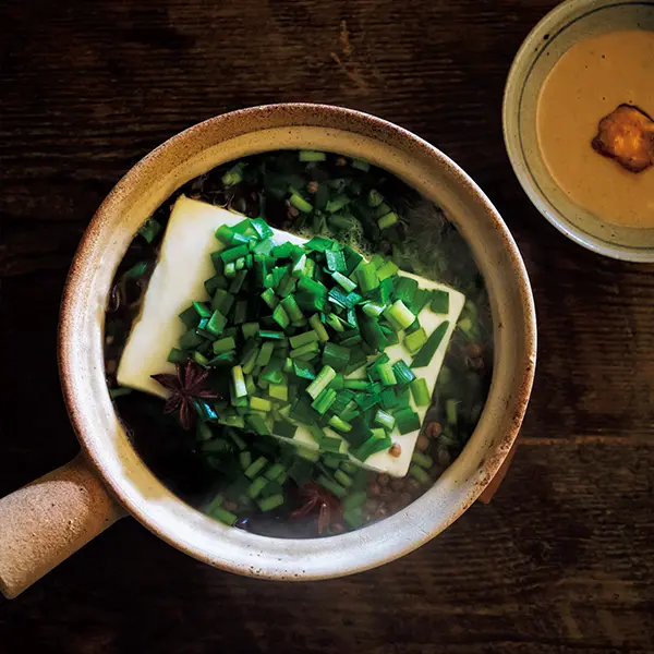 おなじみの湯豆腐に花椒と八角を効かせ、辛味と香りを楽しんで。ごまダレや腐乳をつけると味のアクセントに。