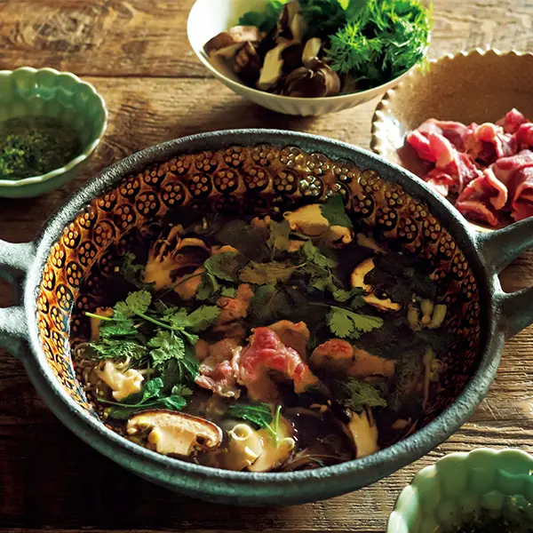 香草やスパイス、和の薬味使いに、目からウロコのアイデアが満載。「シンプルな鍋も、スパイシーな辛味やさわやかな香りなどで目新しい味わいに。最後のスープまでおいしくいただけることを心がけています」(冷水さん)。冷水さんのセルフスタイリングでご紹介。