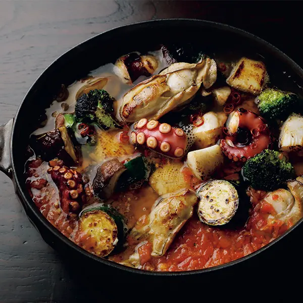 にんにく、赤とうがらしを炒め、素材すべてに焼き目をつけてから鍋仕立てに。少量のトマトでコクを加えて。