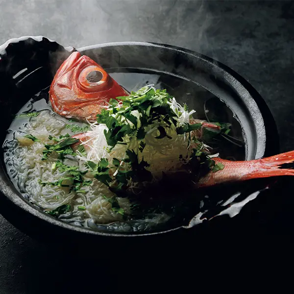 金目鯛の華やかな姿を丸ごと鍋に。締めの雑炊や麵のかわりにしらたきを加えてボリュームアップ。
