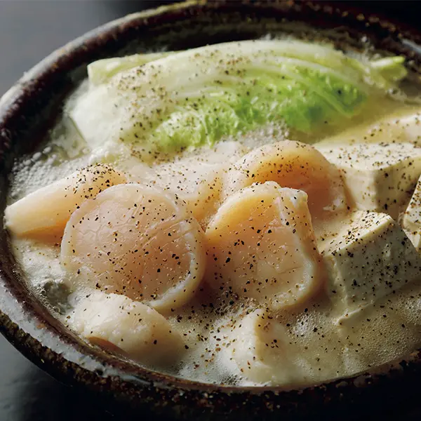 2.白菜が軟らかくなったら、8等分に切った豆腐と帆立を入れてさっと火を通し、黒こしょうを挽きかける。