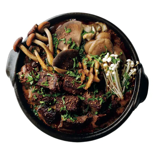 花椒はつぶすか、すり鉢ですって、油で香りが出るまで炒める。そこに、牛肉を入れて、すべての表面に焼き目をつける。牛肉のうま味が閉じ込められ、花椒のさわやかな辛味が合わさって、パンチのある味に。シンプルな鍋だからこそ、下ごしらえで手抜きしないように!