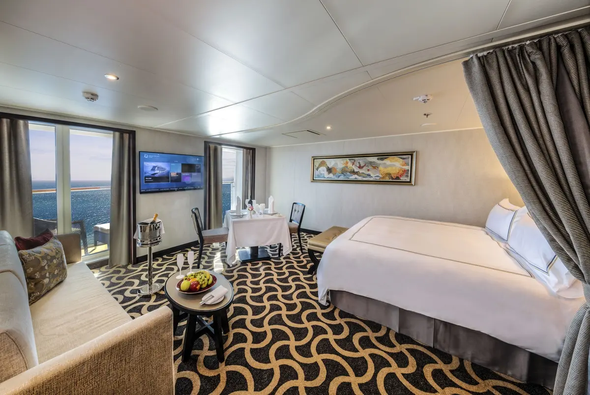 キャビン(客室)は大きくわけて2タイプ。「スタンダード」も快適だけれど、よりラグジュアリーな旅を求めるエクラ世代なら、「パレス」がおすすめ。5つ星ホテルのスイートルームに匹敵するキャビンに加え、パレス専用のレストランやラウンジ、バー、ジム、プールなどを備えた特別な空間だ。