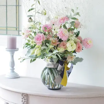 「店で注文を受けたら贈る相手や飾る場の雰囲気はもちろん、そのかたの個性も参考にします。私自身、いただいたブーケが選んでくれた人らしいと記憶に残り、友人を招いた日にシャンパーニュとバラの香りがほのかに漂うテーブルをテーマにして花をあしらったら会話がはずみました。贈り、迎える人の“うれしい”“楽しい”も盛り込むとお互い気負わず、和やかな時間とともに空間の華も心に刻まれるのではないでしょうか」