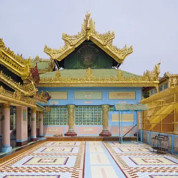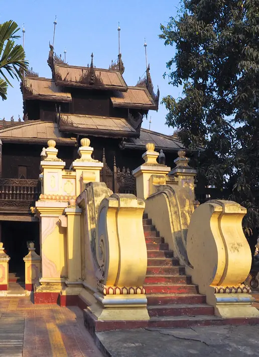 マハムニ パゴダ(パヤー)はマンダレーのポードーパヤー王が1784年に建立したマンダレー最大の仏塔。比較的新しいパゴダだがミャンマー三大仏教聖地の一つとされ、インドに近いヤカインからマハムニ仏を奪い祀られたと伝えられる。そしてマハムニ仏は昔から金箔を張り功徳を得る習慣があり、仏は金箔の重さで昔より太ったと言う人もいる。上座部仏教の掟で、女性は金箔を貼る事は出来ない。またマハムニ仏に近づく事も禁止されている。写真の様に仏像から少し離れてひたすら拝むのである。ところでマハムニ パゴダに代表される仏塔は何層もの複雑な構造から成る。これは、パーヤー タートルーフ(英語読み)と呼ばれ、4角いチークの木枠に仏教縁の装飾が施されたパネルを積み上げた物だ。そして建物はアーチ状の構造が多く見られる。これは英国から伝わった建築技法と言われ、隣国タイの様に植民地を免れた仏教寺院には見られない構造。寺院建築の専門家によれば、マンダレー王朝の中期から20世紀始めにかけて、マンダレーの寺院建築技術や装飾は最高潮に達し、隣のタイやラオスの寺院様式に多大な影響を与えたという。この時代の文化の中心はラングーンでもラッタナコシーン(バンコク)でもなくマンダレーだったのかも知れない。