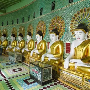 サガインのウーミントンゼーパゴダ。45体の白い仏像はペパーミント グリーンの壁に映え美しい。