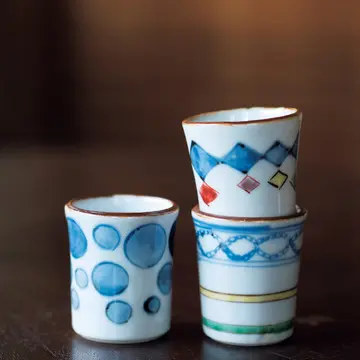 "染付色絵ぐい呑み" は、使い手の想像力をかき立てる軽妙なモチーフが。小付がわりに用いたりデザートを入れたりしても