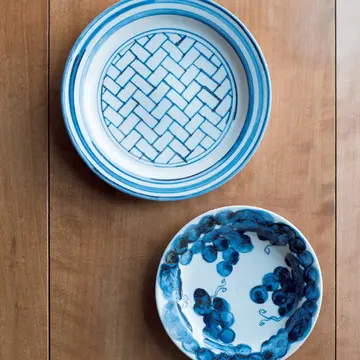 凛とした白を品よく彩る紺青の濃淡が、手描きならではの余韻を残す。料理の和洋を問わず使えそう。(上)染付網代文皿、(下)染付葡萄文皿