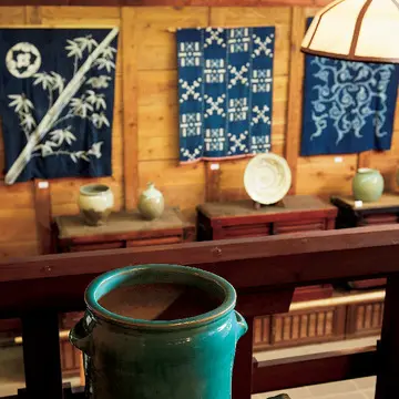 豪農・山本家の広大な敷地内にあり、ゆったりと時間の流れる気持ちのよい場所。米蔵を改築した本館には、有名無名の民藝の器や、出雲地方の藍染などを多数展示