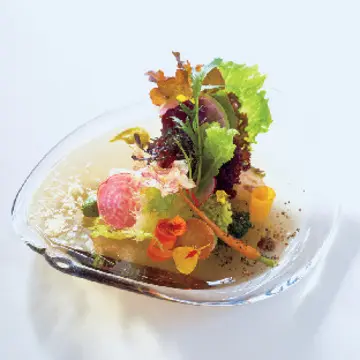 「クリスタルサラダ」。生野菜のみずみずしさにうっとり。サラダを超えたサラダ。野菜はシェフのお父さまが栽培
