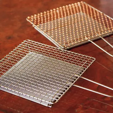 六ツ目に細い竹ひごを潜らせ、花のように編み上げたオリジナルの花六ツ目鉄鉢¥7,500〜(送料別)。底を細工編みにすることで、見た目美しく、強度も増す。