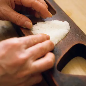 産地指定はせず、その時期の一番おいしいコシヒカリを仕入れ、大釜で炊く。あつあつを木型に詰めて抜き、手塩をした手でにぎる。手塩をすると、塩がついた部分だけごはんが締まって、中はふんわり。米の味もきわだつ