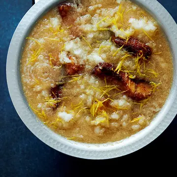 3.1の鍋汁に大根を入れて火にかけ、沸騰したら、豚バラ肉、しめじを加える。火が通ったら、牡蠣と万能ねぎを加える。器に取り分け、黒七味を好みでかける。