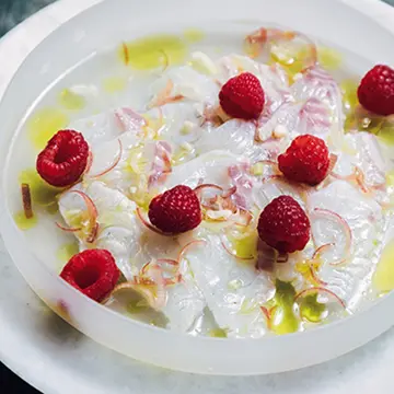 まるで絵画のように美しいひと皿。「歯ざわりのいい生のかぶのスライスと、コクのあるカラスミが相性抜群!塩気はカラスミだけで十分です」。