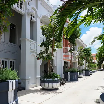 客室棟やショップなど、それぞれの建物が華やかな色で並び、ディズニーランドのよう