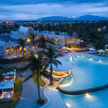 紺碧の海とライトブルーのプール、そしてヤシの木と赤い屋根のコントラストがダナンの夏を象徴している