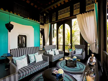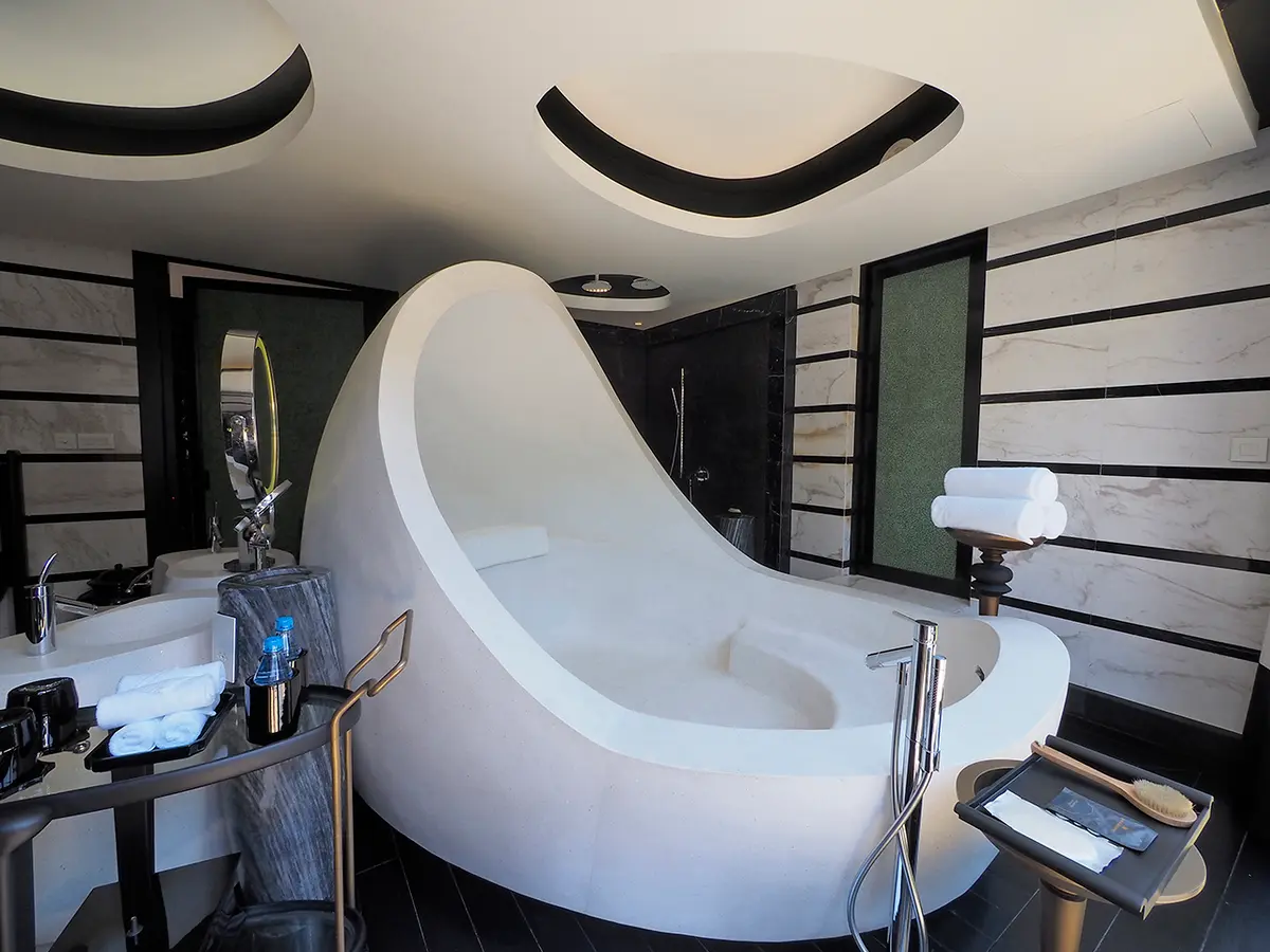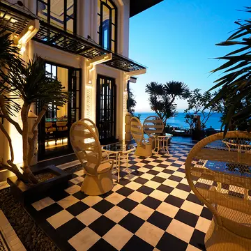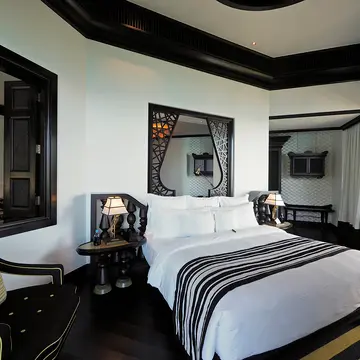 アップダウンのきつい道を抜けてカートで送迎されるヴィラは、伝統的なベトナム風の家屋を意識した黒い瓦と白壁の外装で、カテゴリーにもよるが4室で一棟の造りになっている。内装は、白黒ストライプに原色をあしらった大胆な色使い。ここでもアジアンテイストの木彫が落ち着きを添えている。時々、山のサルも訪れるという広いオープンテラスは、リビングスペースを兼ねていて、晴れていれば180度の景観を独占できる。