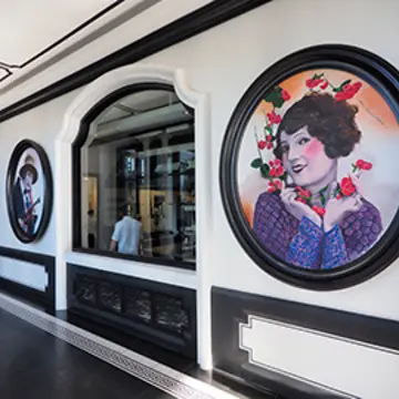 「ラ メゾン1888」のエントランス。19世紀末のフランスを思わせる壁画