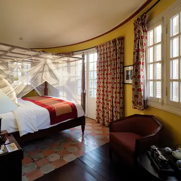 フレンチコロニアルを忠実に再現したお手本のようなホテルだが、もちろん設備は21世紀のレベルで、メンテナンスも申し分ない。手入れのよいロイヤルガーデンや、珍しい塩水プール、スパやフィットネスセンターも備わっている。街の中心のフォーン川に200mに渡って面していて、王宮遺跡群のフラッグタワーや、田園風景も眺めることができる好立地にある。商店街までは歩くと少し遠いが、無料のレンタサイクルもあり、タクシーなら10分程度で料金も安い。