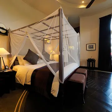 カテゴリーが上の部屋は、蚊帳つきのフォーポスターベッド。家具はアンティークな木製
