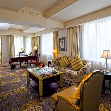 スイートルームのリビングスペース。主な調度品はフランスから取り寄せたアンティーク家具