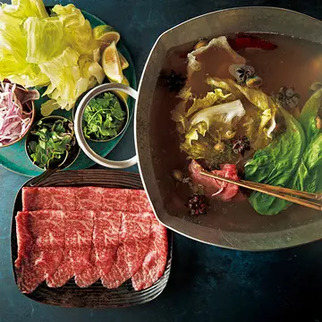 2.鍋にAを入れて香りがたつまで炒め、Bを加えて煮立てる。1の野菜を適宜加え、ラム肉をしゃぶしゃぶする。好みでごま油、塩、パクチー、クミンシードをつけていただく。