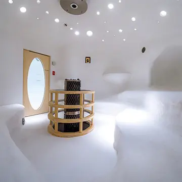 古都・鎌倉の駅前に位置する和をテーマにしたホテル。宿泊客がこぞって利用するという貸し切りのサウナは、凛とした空気が漂う茶室のような空間だ。ロウリュには贅沢にも緑茶を使用。熱いサウナストーンにお茶をかけると、茶葉を煎ったときのような香ばしい香りが広がり、エクラ世代の利用客の間では「昔お茶屋さんの前を通ったときに嗅(か)いだ、懐かしい香り」と大評判だとか。水風呂は五右衛門風呂で、かけ流しで水が出ているので、温度キープも完璧。