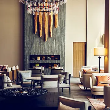 横浜市内や遠く富士山を一望する、天井の高いロビーラウンジ。照明のデザインテーマは“森林浴”
