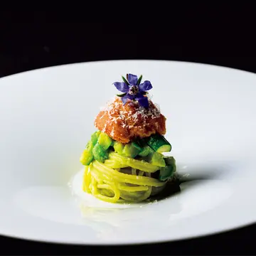 板前に立つのは、香港『鮨とかみ』で経験を積んだ藤本大輝さん。「江戸前の伝統を守りながら、今を感じさせるクリエイティブな味でお客さまに喜んでいただきたい」と語る。例えば、定番の前菜「招き猫最中」では、あん肝のペーストに奈良漬とカシューナッツをしのばせ、最中に詰める。一方、マグロなど脂がのったネタには赤酢の酢めしと、酢めしを2種類用意。マグロは、高名なマグロ専門仲卸「やま幸」の山口幸隆さんがアドバイザーを務める。ソムリエの浅見勝敏さんのワインペアリングは、自然派まで経験豊かな視点でのセレクトで、食通をうならせている。