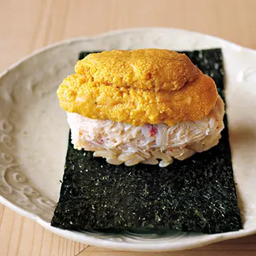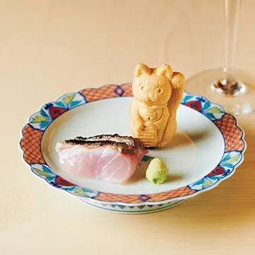 お店の名物「ミルフィーユ」は、シュー生地に赤酢の酢めしとマグロの中落ち、甘海老、イクラ、ウニ、キャビアを重ねた豪華な一品。シュー生地が食感のアクセントとなって、酢めしの甘味が感じられ、新鮮なおいしさ! マグロやカツオはていねいにすじをとり、とろける食感に仕上げるなど工夫を凝らしている。とはいえ、鮨そのものは王道で、“遊び心”との振り幅が楽しい。