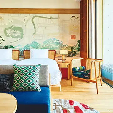 ’22年10月、富山県・砺波市に開業した『楽土庵』は、古民家を改築した一日3組限定のアートホテル。屋敷林に囲まれた農家が広大な田園地帯に点在する農村景観“散居村”の中に位置している。伝統的な景観や館内アート、料理、アクティビティなどを通じて、富山で人と自然がつくり上げてきた“土徳”を体感してもらうことがコンセプト。北欧や李朝の家具、民藝から現代美術まで、独自の審美眼に貫かれた工芸やアートが館内に配されているのも心地いい。泊まる人がゆったり安らげる空間であると同時に、宿泊代金の2%が散居村保全活動にあてられるなど、地域の再生にもつながるサステイナブルなホテルだ。地元の豊かな食材で表現するイタリア料理レストランも魅力。