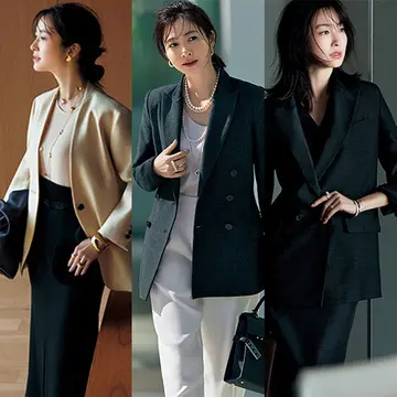 働くエクラ世代のための新しいワーキングスタイルを提案。「ドメル」のタキシードジャケットをまとって、従来の枠にとらわれない新しいコーデでビジネスシーンを盛り上げる。