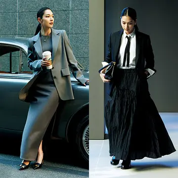 グラスを持つ手で乾杯したり、遠くの知り合いに手を振ったり。会食シーンではなにかと気になる二の腕まわりを優雅にカバーしてくれるケープがうれしい一着。流れるようなドレープは腕まわりだけでなく全身を静謐(せいひつ)な華で包み込んでくれるよう。高品質なヴァージンウールのライトグレーの素材感もビジネスの会食シーンにふさわしい。