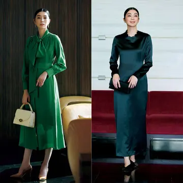 会食シーンでの装いの正解は、上質な素材感と、テーブルに着いた際にきわだつよう上半身に美しいディテールがあるワンピース。所作まで美しくみえるドレープケープのワンピースに注目。